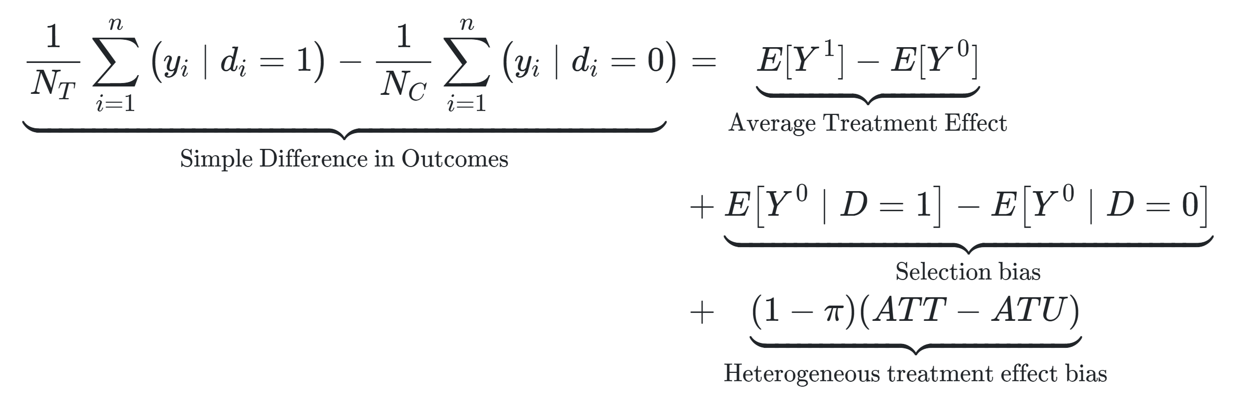 Esta descomposición está demostrada en el libro y es la explicación “técnica” de porqué el SDO usualmente no tiene interpretación causal: los sesgos de selección y de efectos heterogéneos hacen que el SDO sea distinto del ATE.