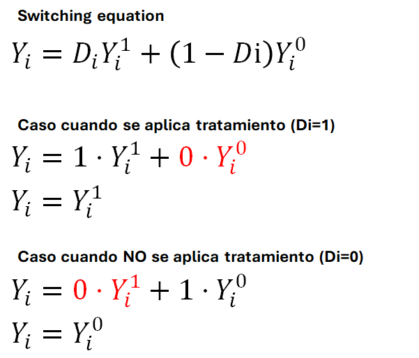 La idea aquí es que en el mundo real observamos sólo el outcome real (\(Y_i\)) que corresponde a la materialización de uno de los dos outcomes potenciales (\(Y_i^1, Y_i^0\)) en base al valor tomado por \(D_i\): si \(D_i=1\), entonces \(1-D_i=0\) y la ecuación colapsa a \(Y_i=Y_i^1\) (y viceversa cuando \(D_i=0\)).