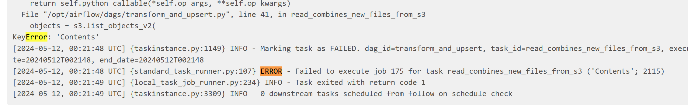 For example, when read_combines_new_files_from_s3 failed while I was writing this article, I looked for “ERROR” and found hints that the problem was related to accessing the ‘Contents’ of the dictionary returned by the s3.list_objects_v2: