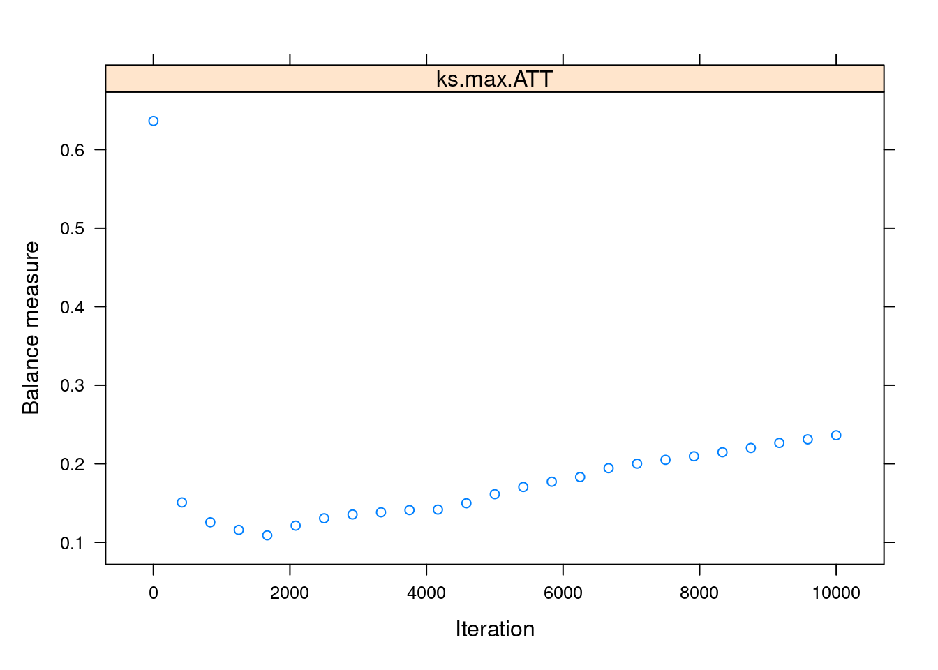 We can see that the balance is maximised somewhere below the 2000th iteration. This “optimal” iteration is the one used for the “final” propensity scores, which are stored under the name ps in the returned object.