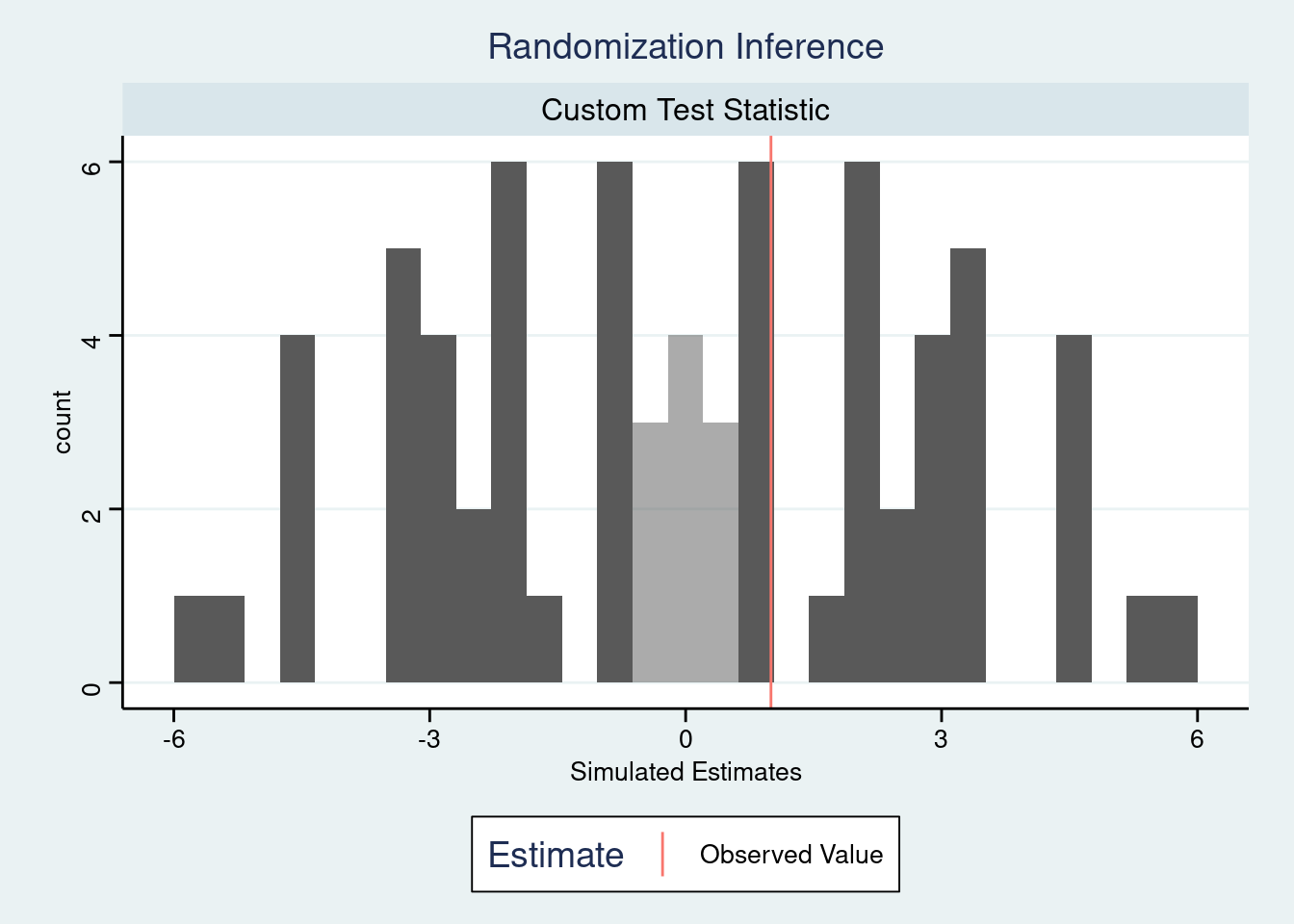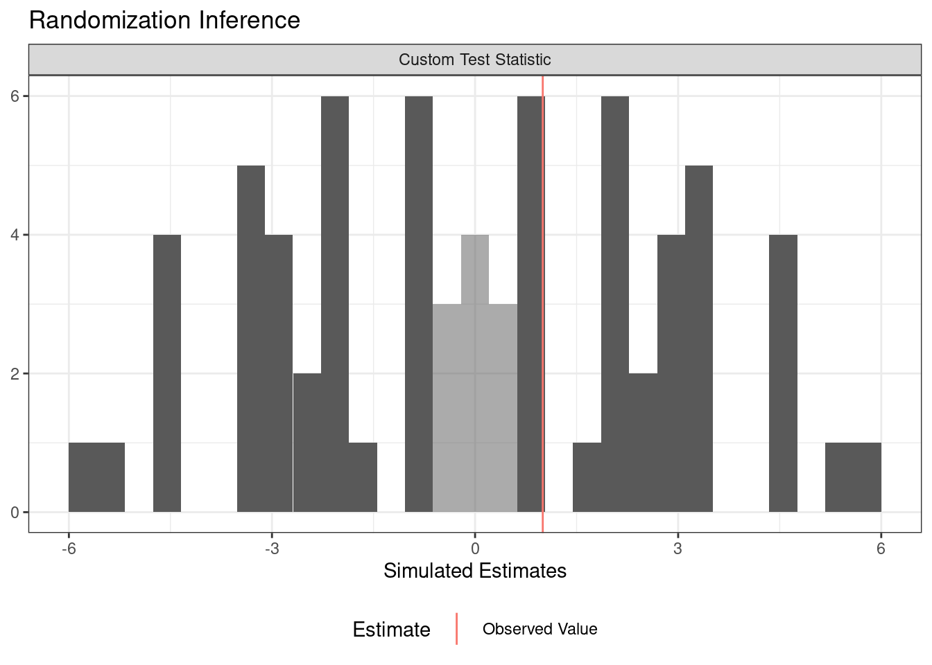 ri2::conduct_ri, which is one of the RI implementations existing in R, performs 1000 simulations/permutations by default.↩Of course, it’s a bad idea to repeat the RI test many times using different statistics until finding one that rejects the null since that would qualify as p-hacking. The test statistic, I think, should be part of the experiment design.↩