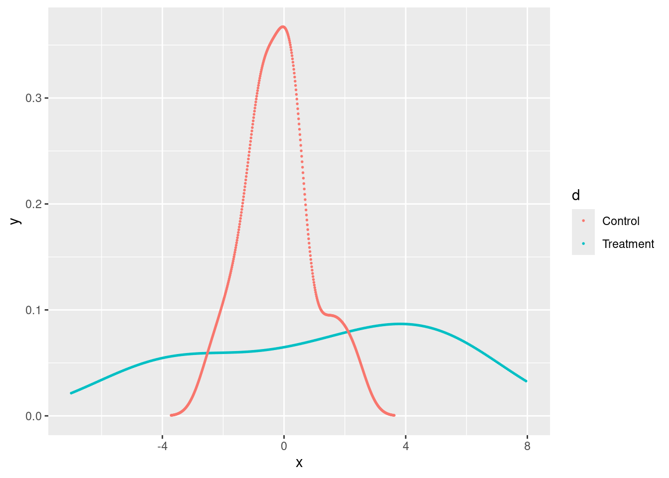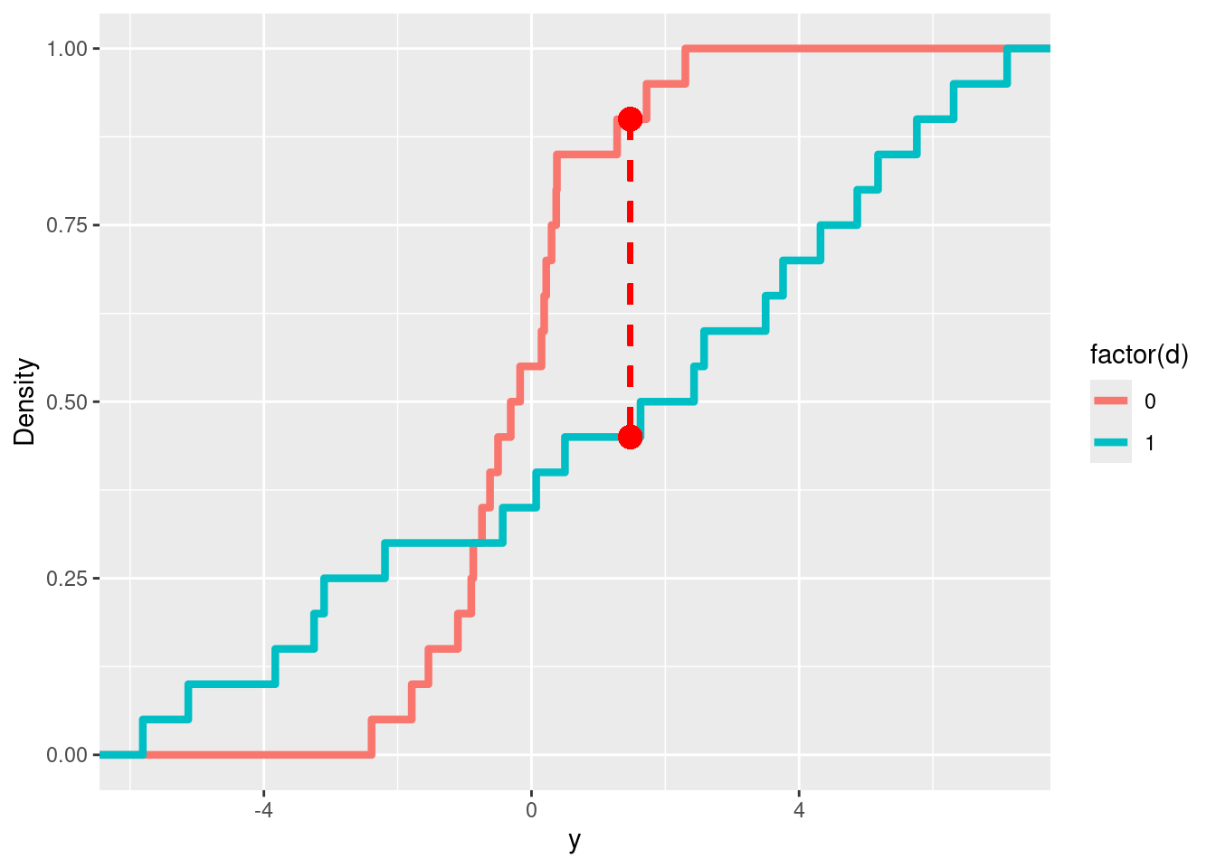 KS statistic (Kolmogorov-Smirnov), which detects differences between outcome distributions by measuring the maximum distance between the cumulative distribution functions. This statistic would allow us, for instance, to identify the effect of a treatment that changes the variance or dispersion of the outcome but not its mean.