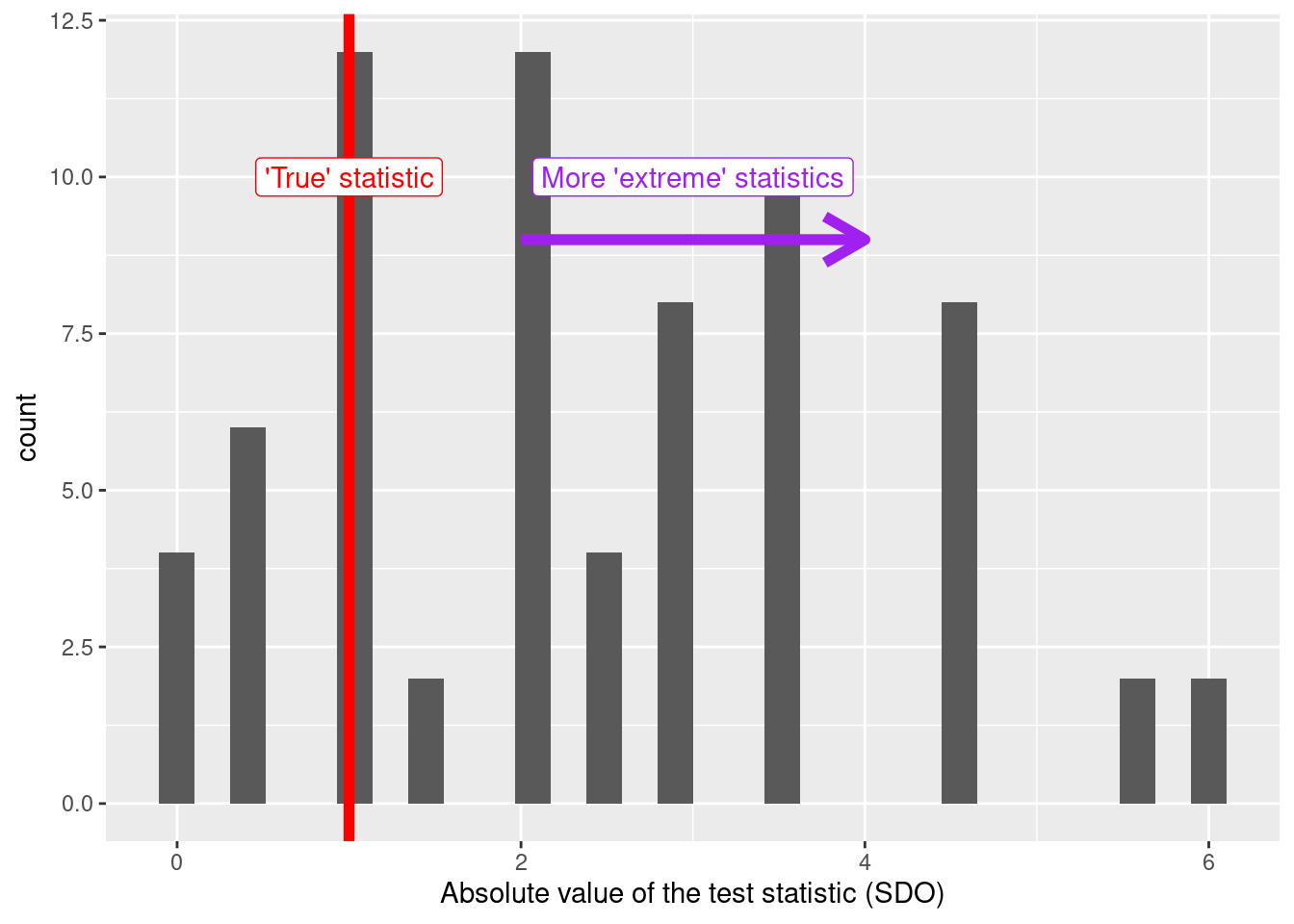 After having obtained the statistic’s distribution (exact or approximated) under the sharp null, we can proceed to locate the true statistic (the one that comes from the real values of \(D\) and \(Y\)) inside that distribution.
